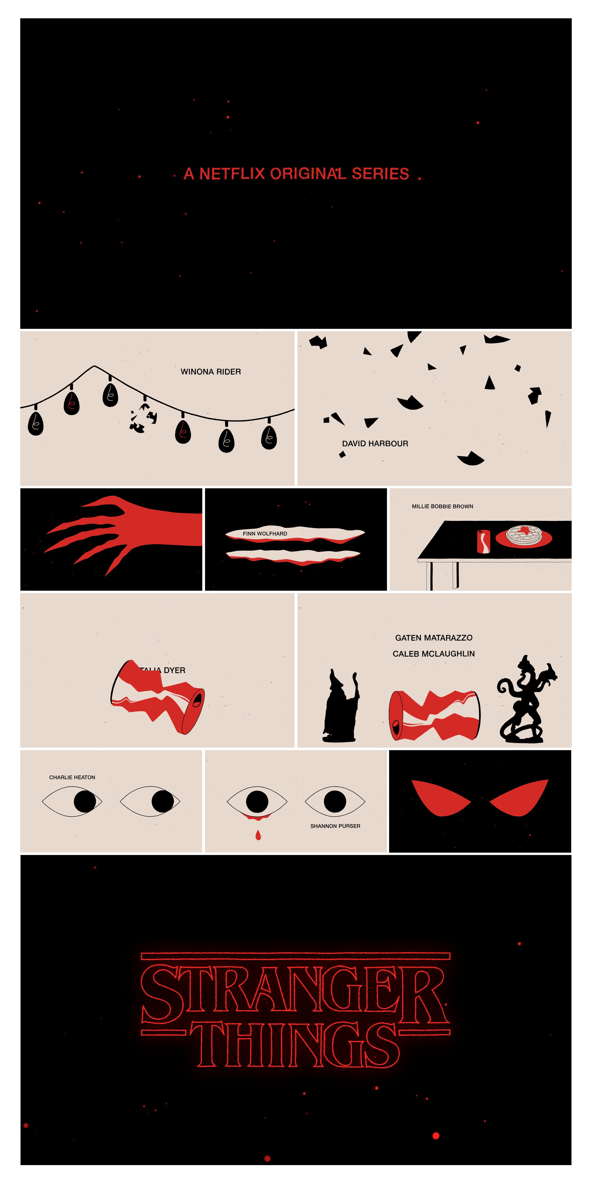 This title sequence focuses on key visual elements from Stranger Things season 1. Utilizing a Saul Bass visual style, the goal for this sequence was to create a seamless narrative that matches the tone of the show and gives viewers a glimpse into the story without giving too much away.