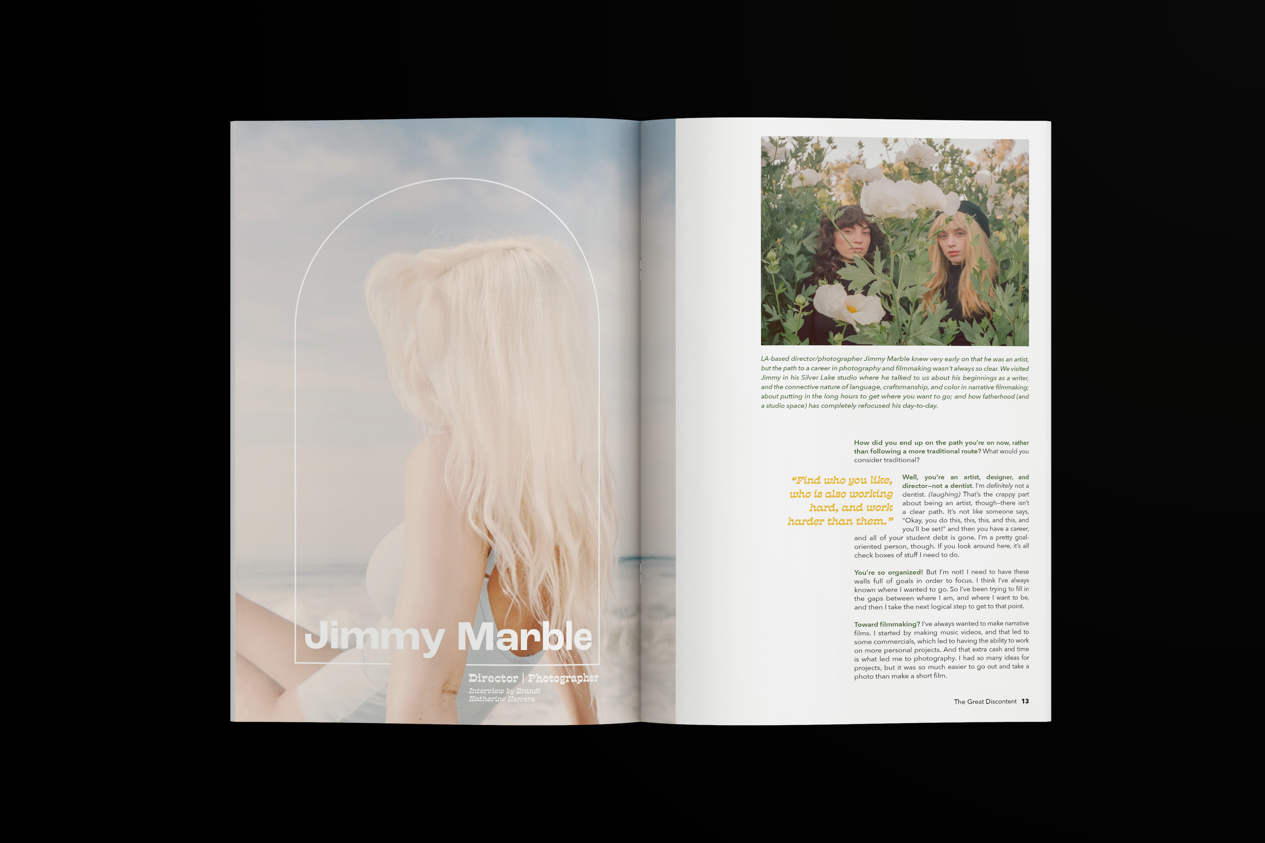 Feature article spread for The Great Discontent magazine showcasing an interview with Jimmy Marble and his photography. Marble’s photography is grounded in movement, color, and idealism, which is reflected in strong grid-use, neutral yet bright colors, and evenly justified text that allow the photography to shine while still drawing the readers into the story.